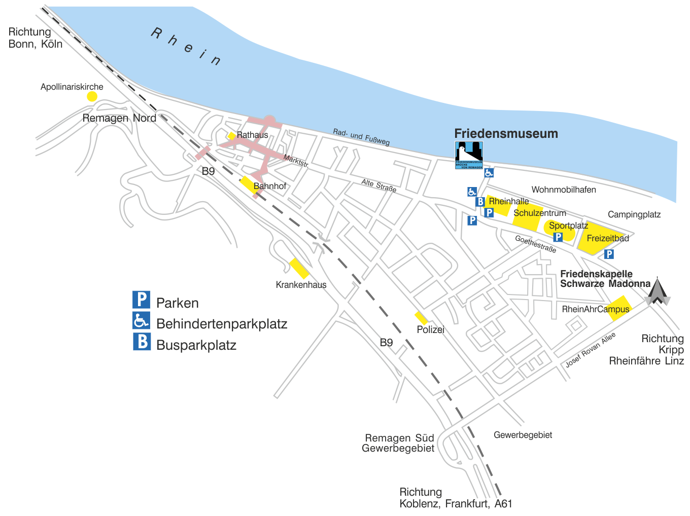 Das Museum selbst ist nicht unmittelbar mit dem Auto zu erreichen. Vom Parkplatz an der Rheinhalle Remagen (Goethestraße) aus sind es aber nur knapp 300 Meter Fußweg bis zu den Brückentürmen.